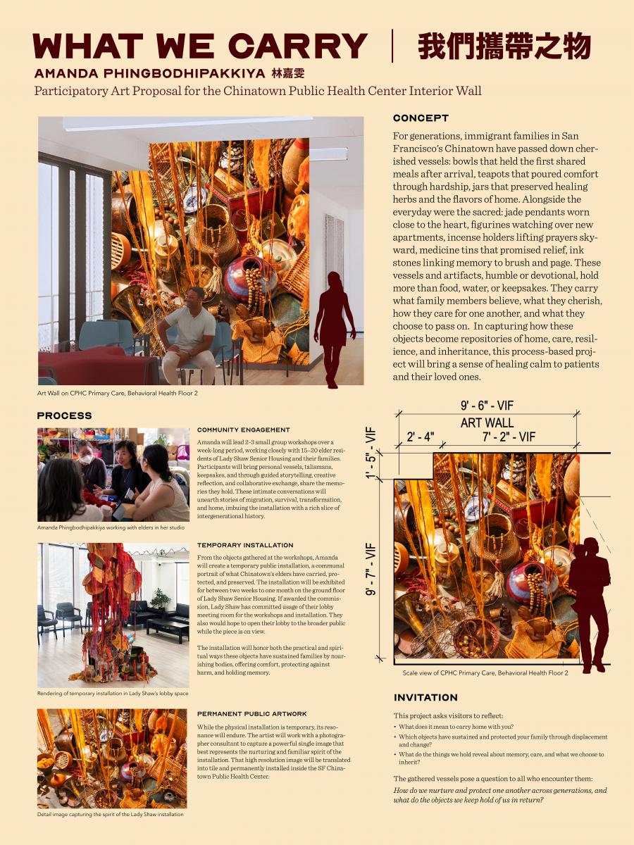 Amanda _Phingbodhipakkiya_What We Carry 我們攜帶之物 board.jpg《What We Carry》(我們攜帶之物牆)為一件扎根於華埠生活記憶的參與式公共藝術作品。在為期一週的展覽中,Amanda Phingbodhipakkiya 將邀請邵逸夫爵士耆英中心中 15 至 20 位長者與其家人,攜帶他們家中珍藏的器皿與護身符。在小組工作坊裡,參與者將分享飯碗、茶壺、罐子、玉墜、小雕像、香座、照片、藥罐和硯台,以及這些物件如何牽起初次的膳食、庇佑、療癒和歸屬的情感。透過引導式故事講述、創意反思和合作交流,將呈現出遷移、留存和照護的跨越世代生命故事。