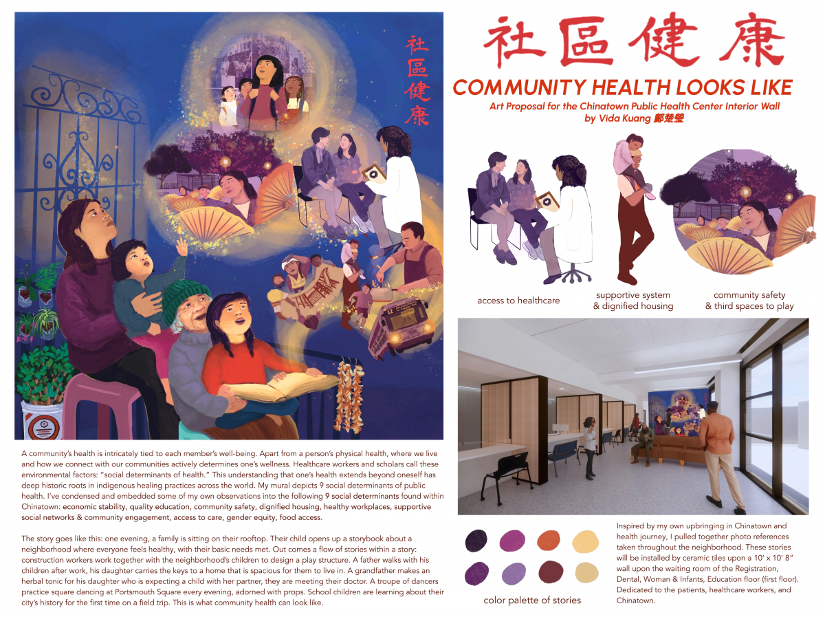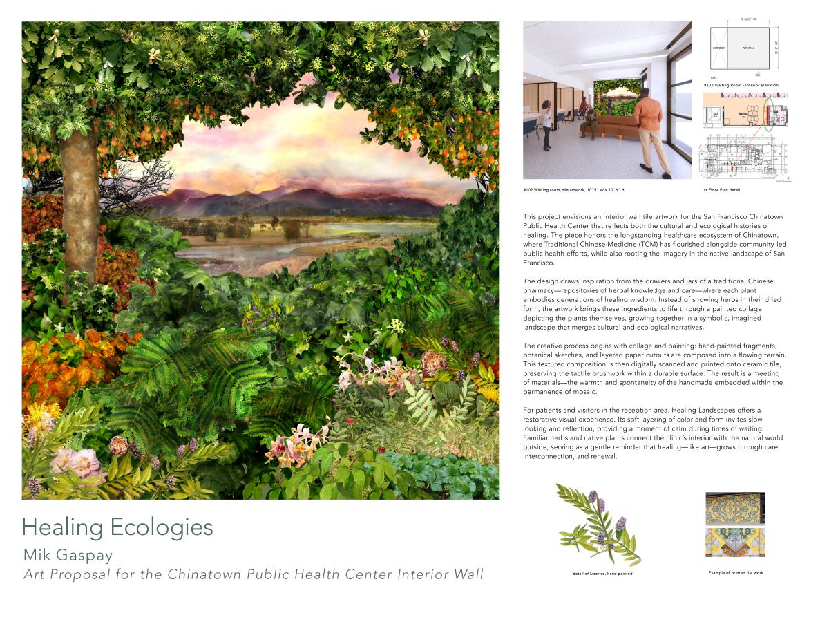 Mik Gaspay_proposal_concept_v4d.jpg本計劃構想在三藩市華埠公共衛生中心室內牆面設置一件瓷磚藝術作品,呈現兼具文化與生態脈絡的療癒歷史。該藝術作品向三藩市華埠長久以來的醫療保健生態系統致敬,其中中國傳統醫學與社群主導的公共衛生努力並肩發展;同時,畫面也取材於三藩市原生景觀,讓治癒的意象在 此扎根。